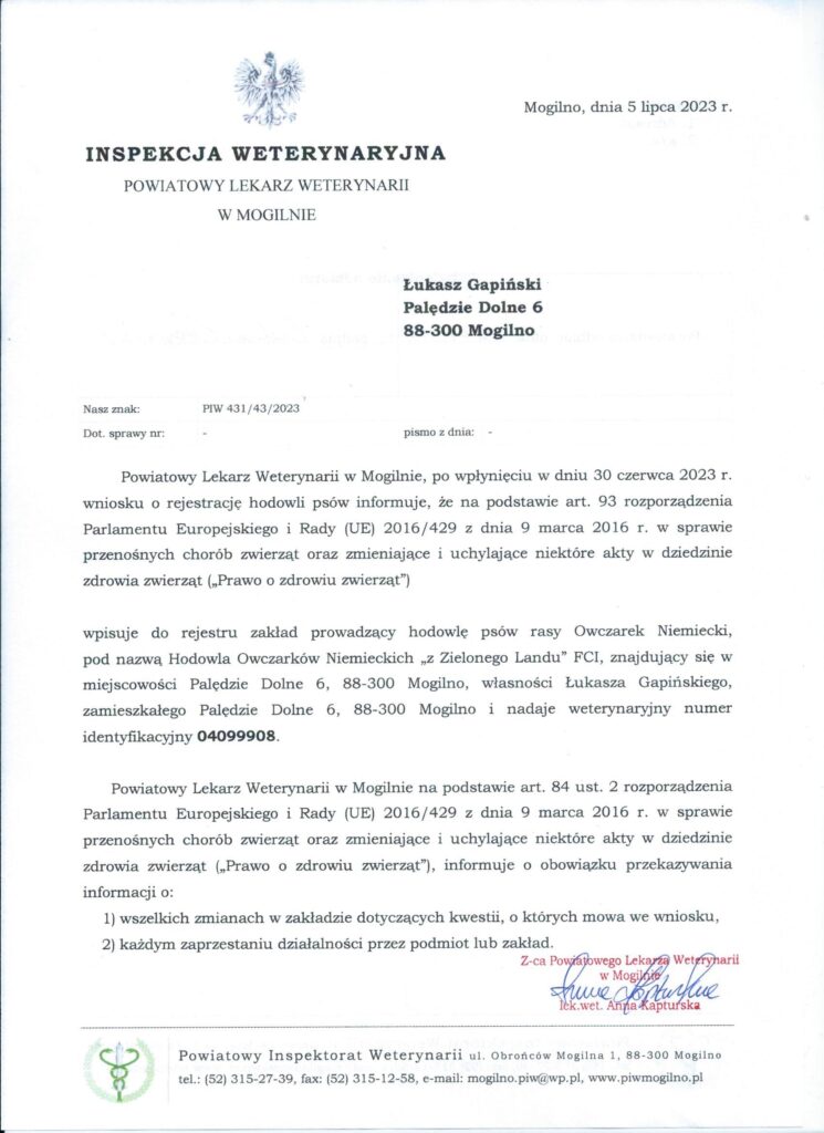 Nasza hodowla działa pod nadzorem Powiatowego Lekarza Weterynarii